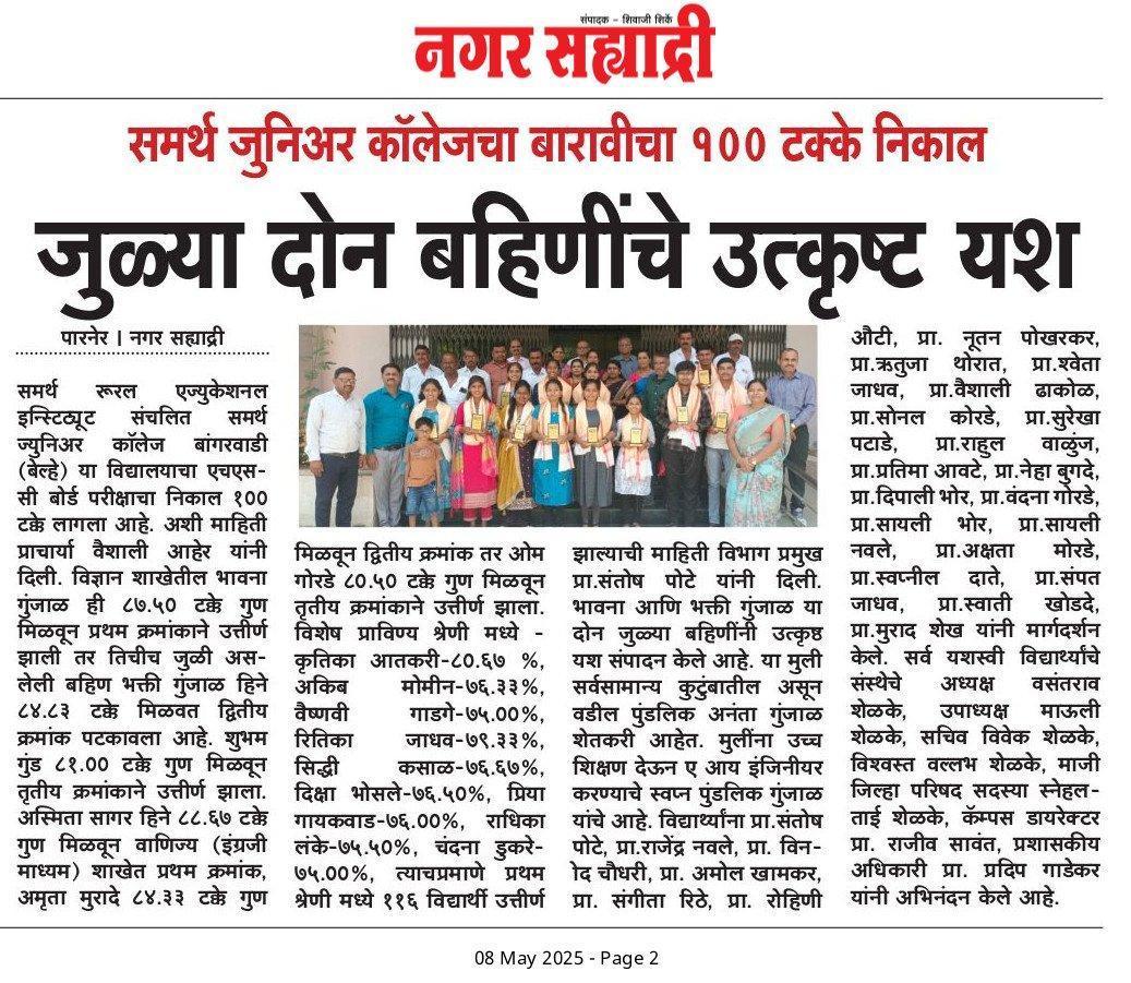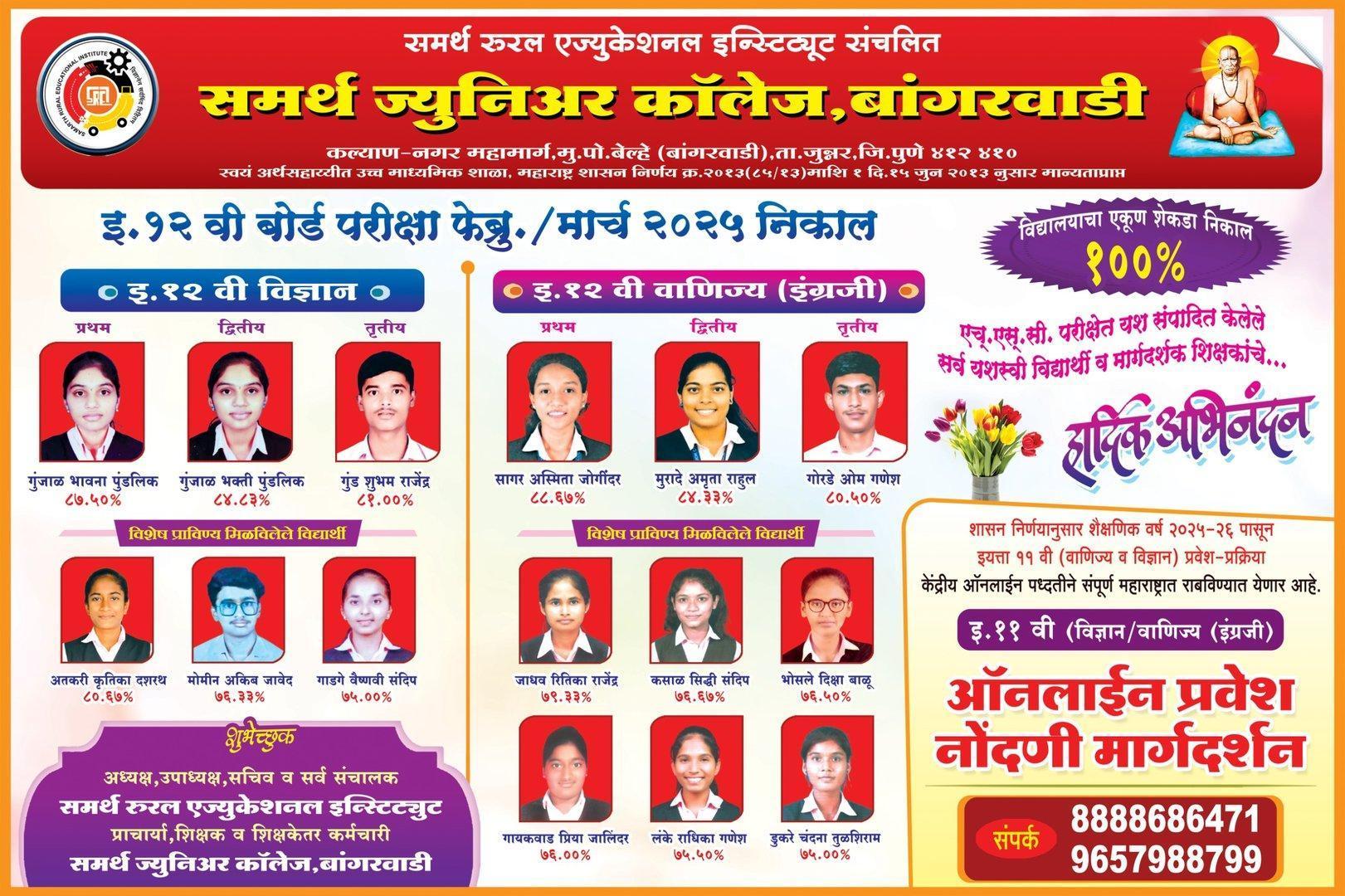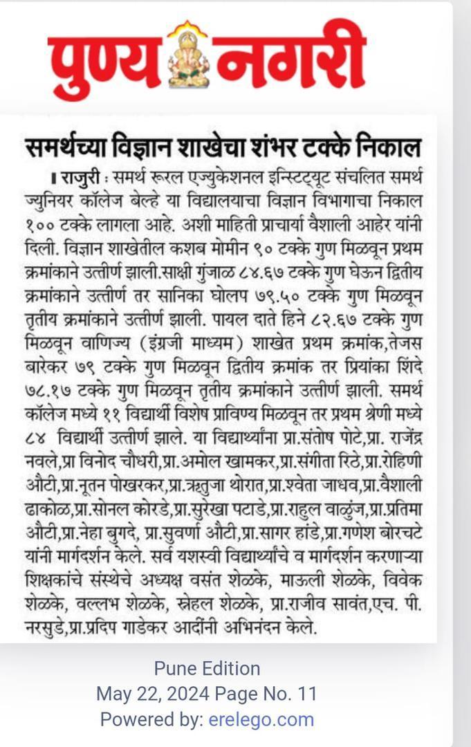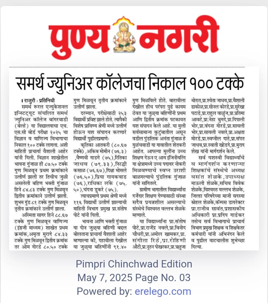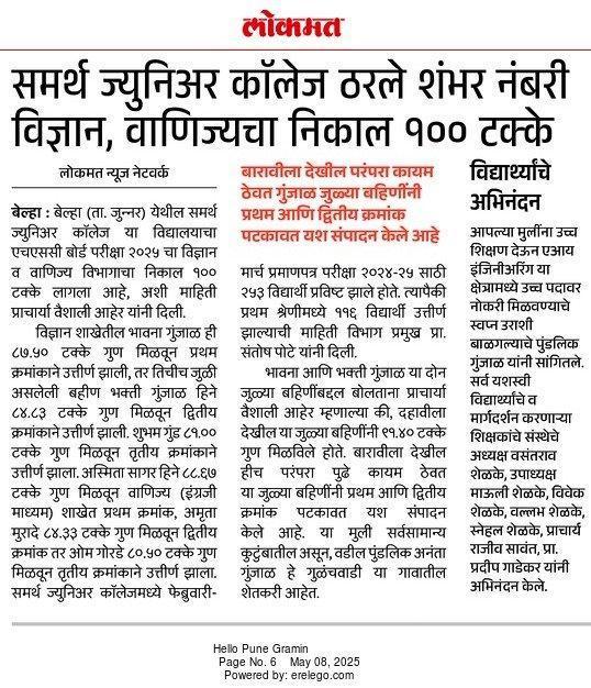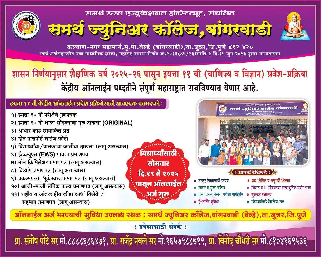 Samarth Junior College is established in the year 2013. Samarth Junior College is recognized by State Government of Maharashtra. The college has earned reputation as a center for quality education in Science and Commerce due to excellent infrastructure, well equipped laboratories, experienced and dedicated teaching staff, well stocked library with internet facility, cultural center and sport facilities. College has built one of the biggest sport grounds nearby. The main goal of Samarth Junior College is to emerge as a role model in higher secondary education in India and excel in each and every sector of profession.